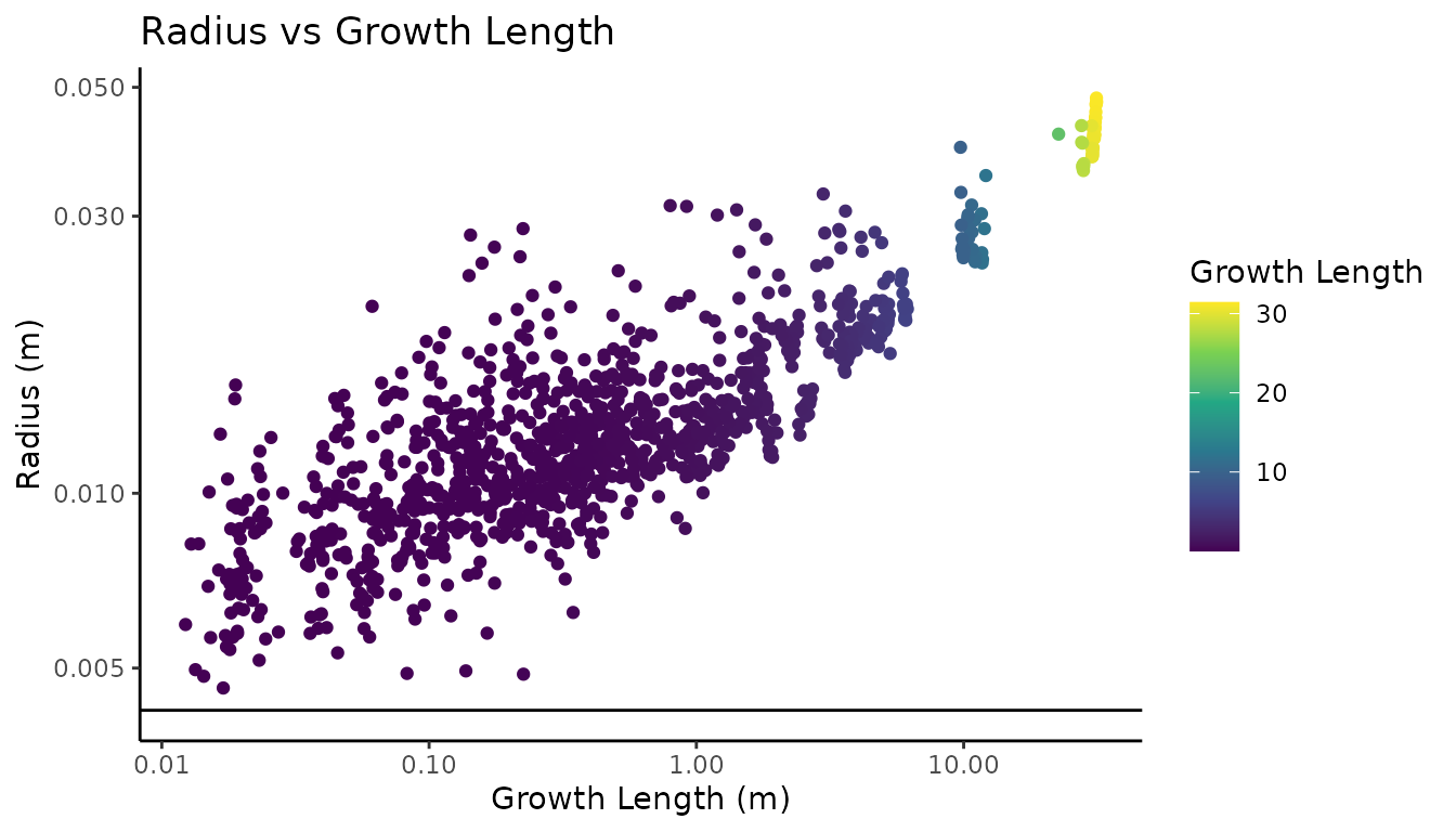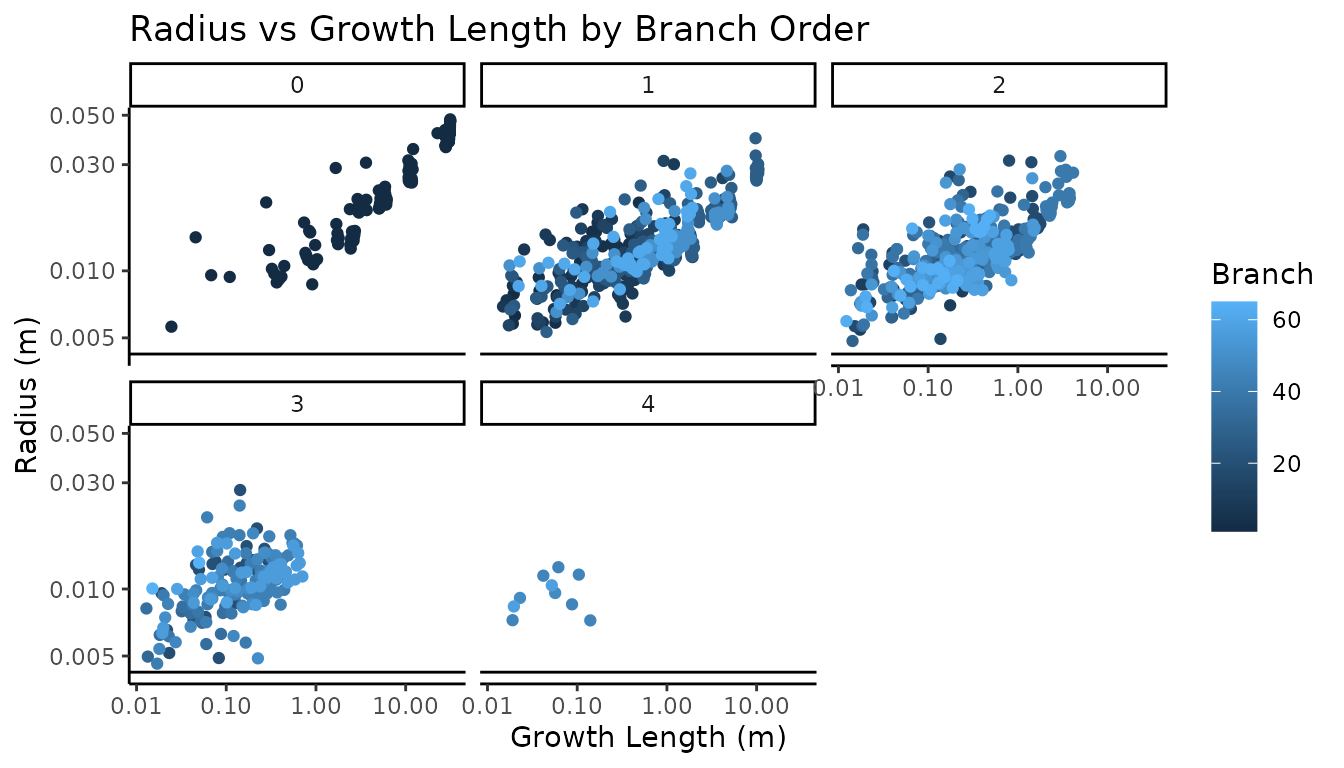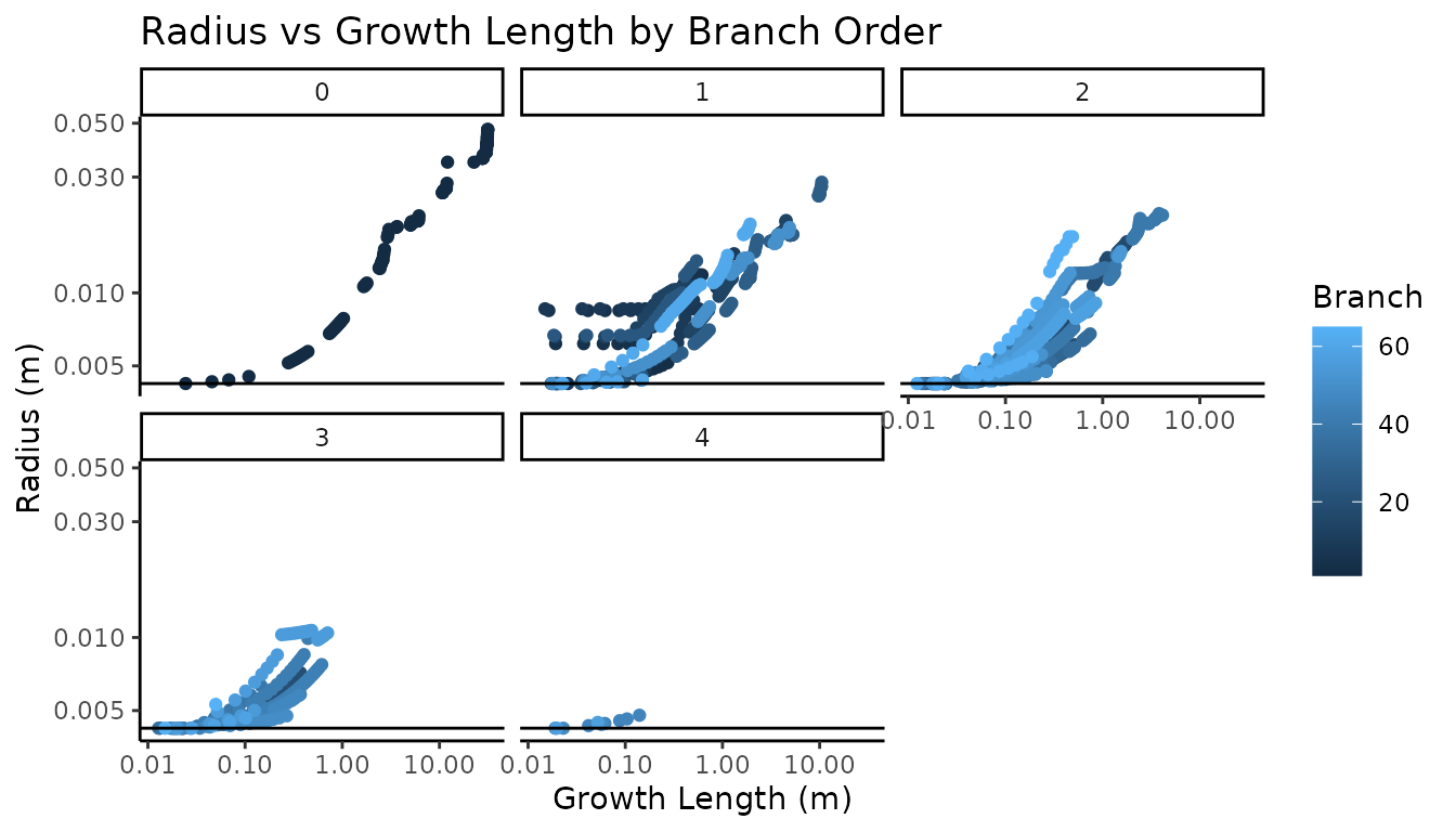 Looking at the diagnostic plot, we can see that individual branches can clearly be identified by their unique allometry. Notice how nearly all of the volume reduction occurred in the higher order branches, with the main stem remaining nearly unchanged. The branches now taper towards the measured twig radius for Kentucky coffee tree. Getting the real twig diameter is critical, as too high a value will overestimate volume, and too low a value will underestimate total volume, with the over or underestimate being proportional to the number of twigs and small branches in the tree. If your species is not available in the database, we have found that the genus level twig radius average is a good substitute.