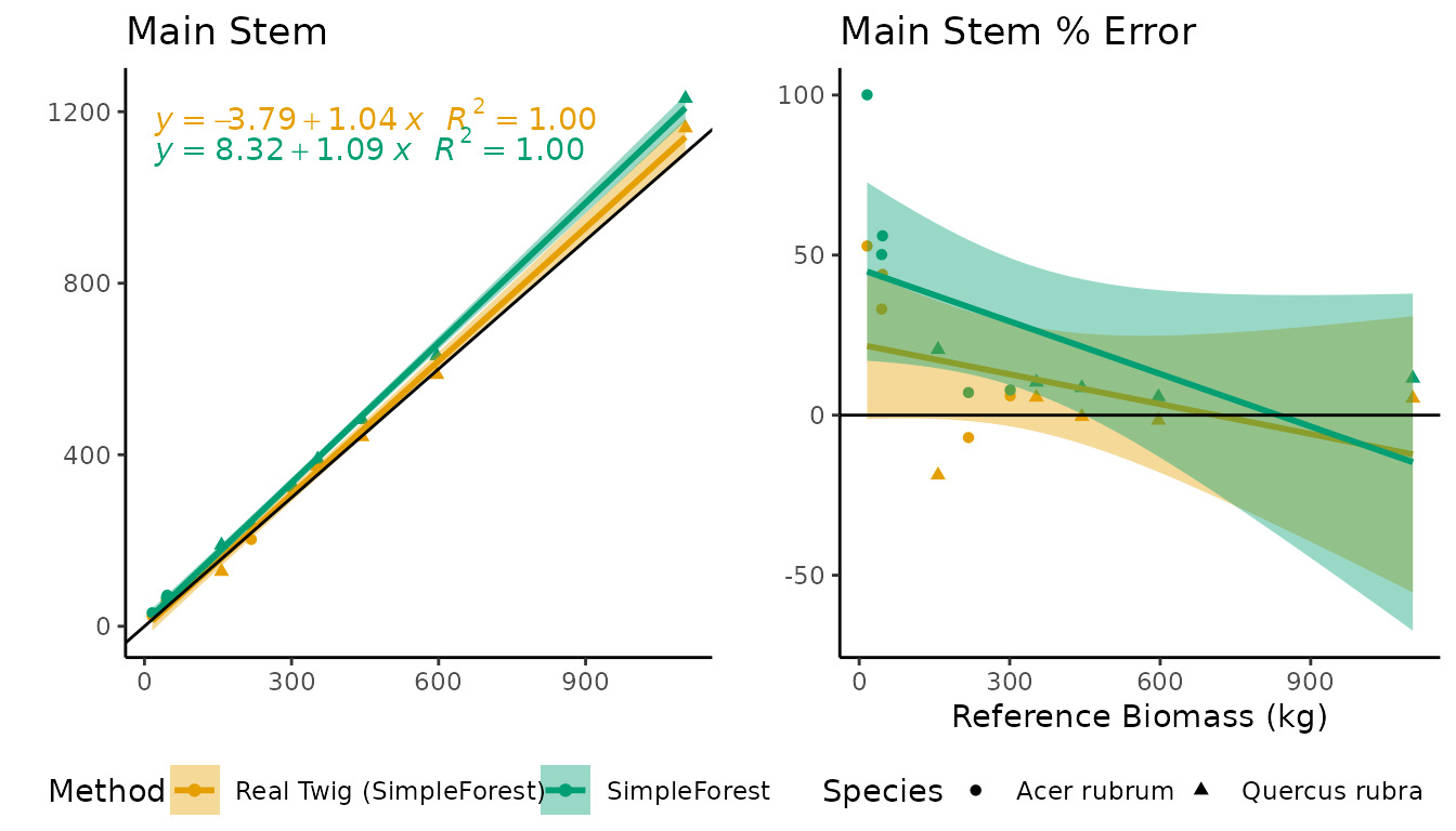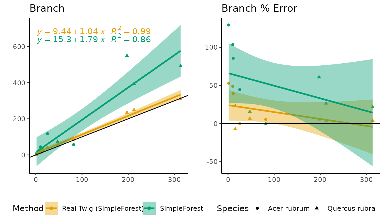 Below are the mass estimates and statistics using SimpleForest v5.3.2 with its built in vessel volume correction, and Real Twig applied to the same QSMs.